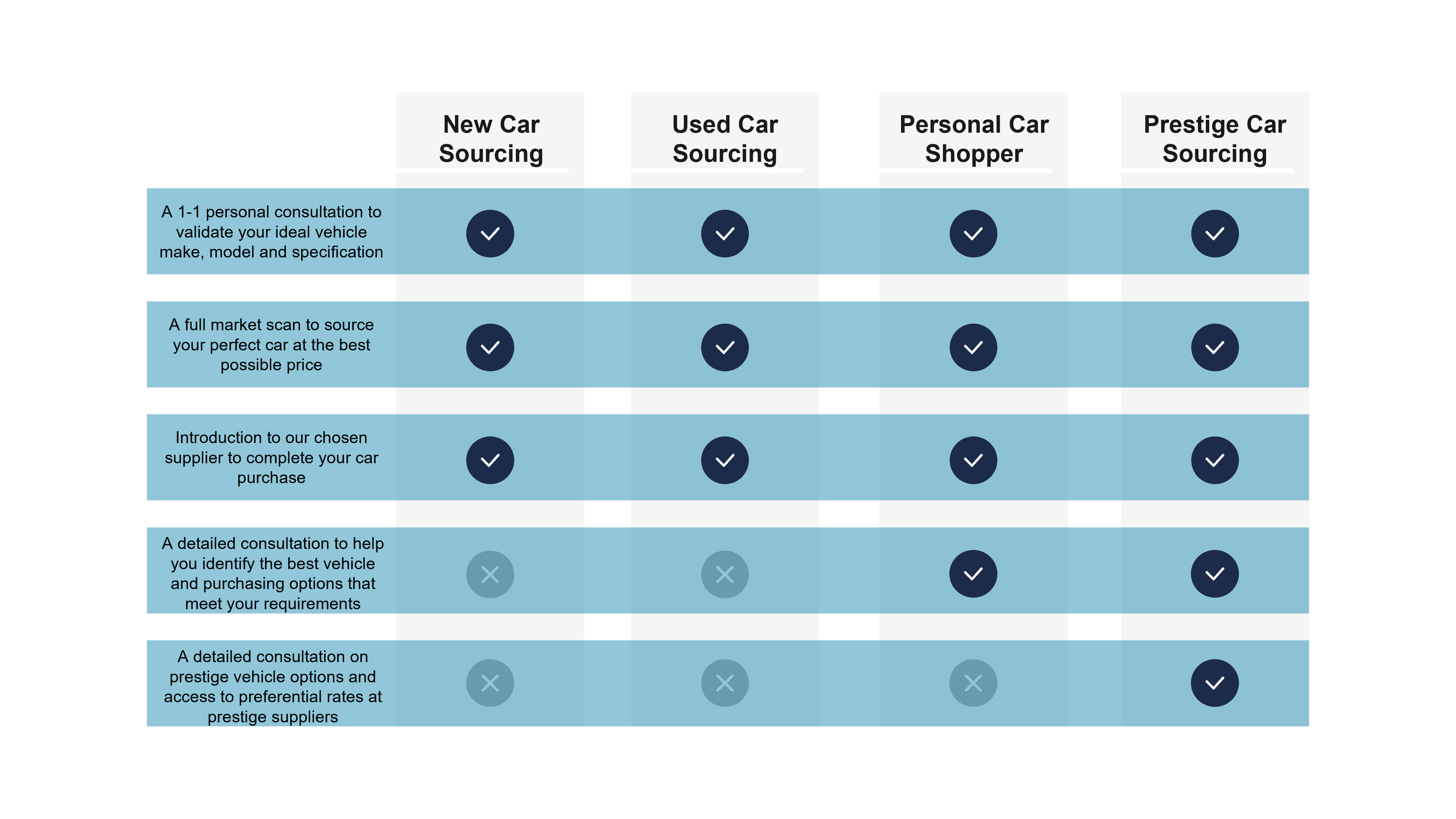To help you choose the right service for you, have a look at the benefits of each service below and also use the "Find my next car" link in the navigation menu which will recommend a service and capture your personal requirements.
